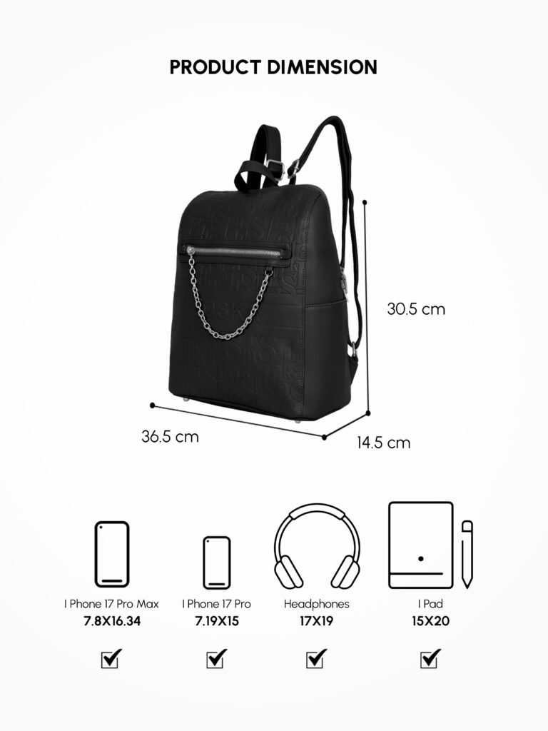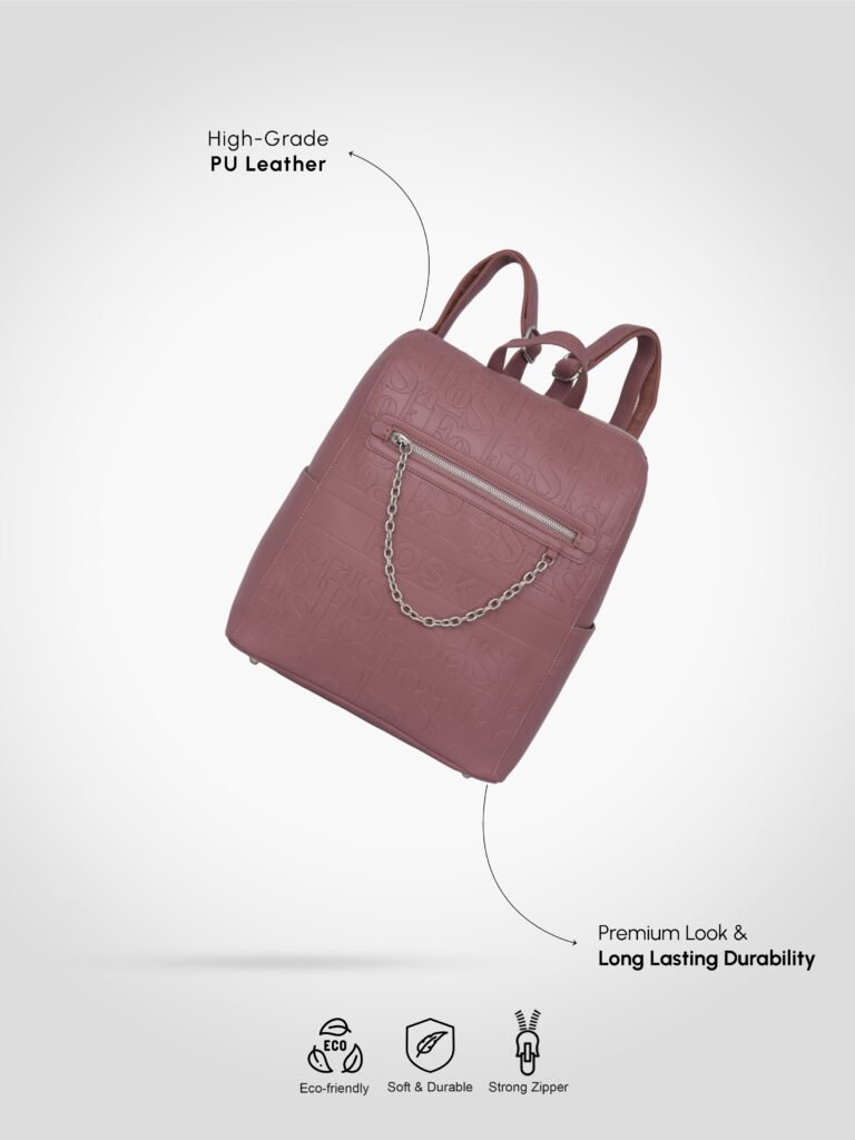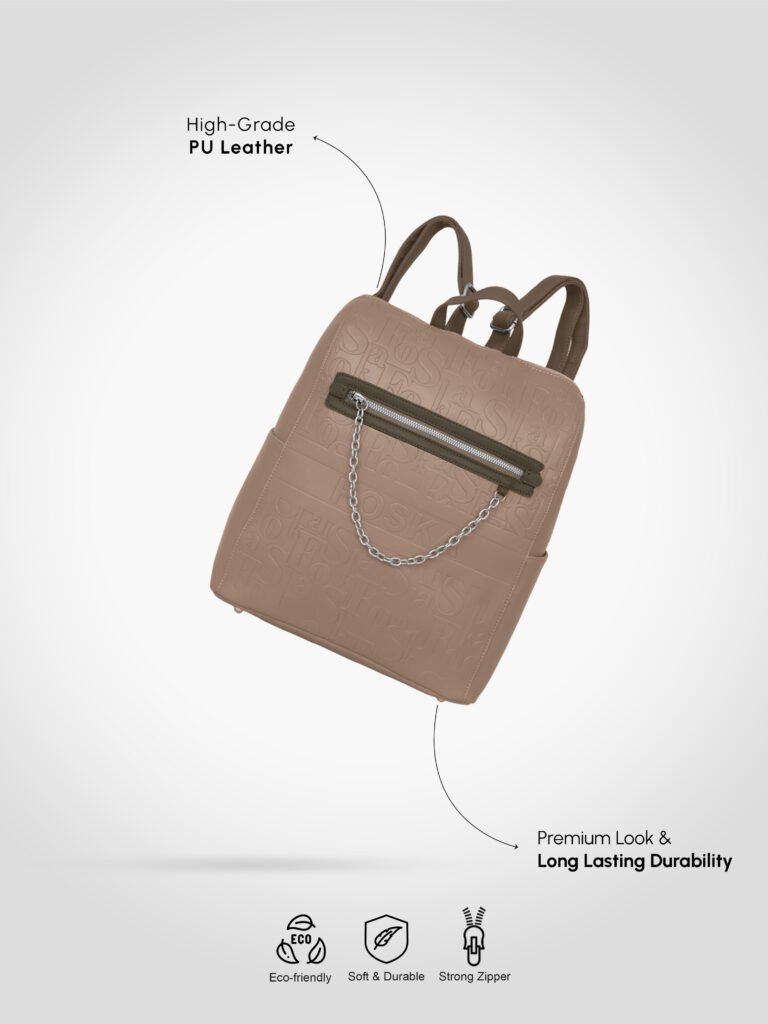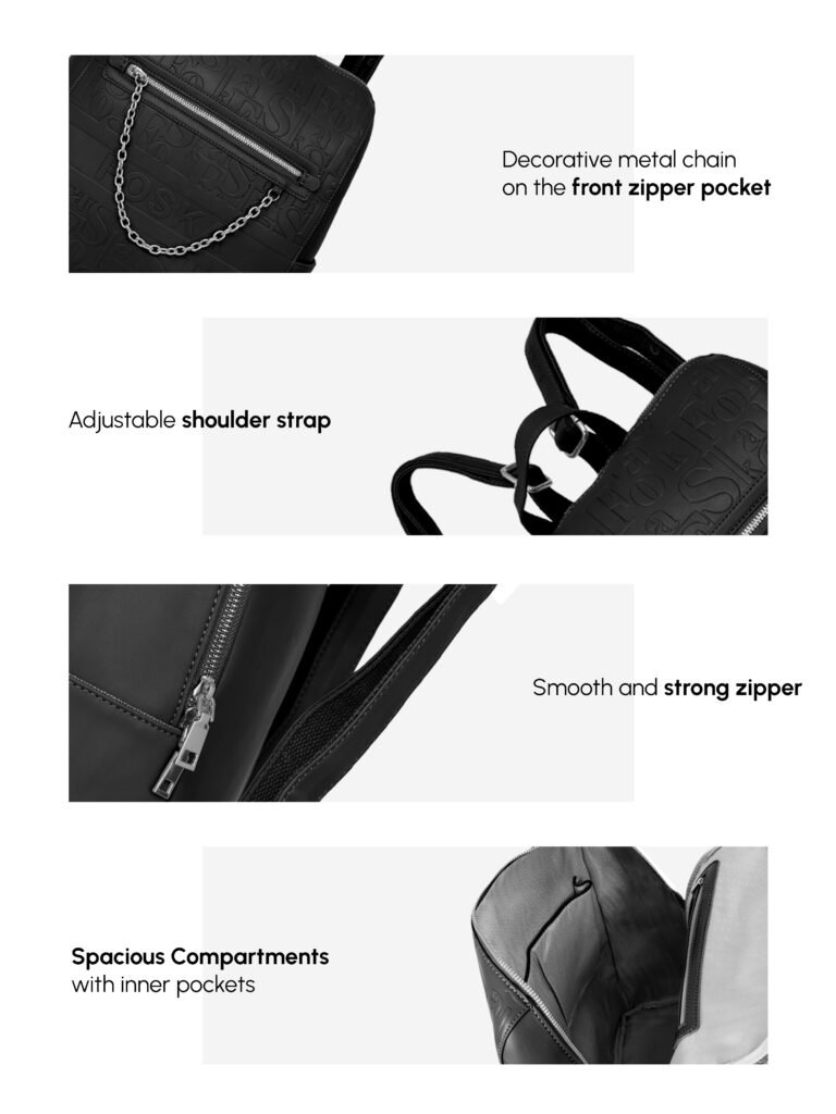 Design: Features a distinctive all-over embossed “”Foska”” logo pattern and a decorative silver-tone chain accessory on the front zipper pocket. It has a classic backpack silhouette with a secure top zipper closure.