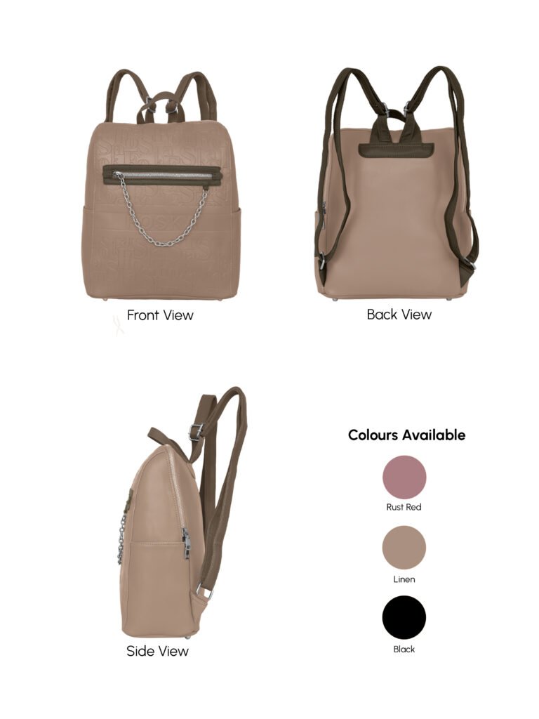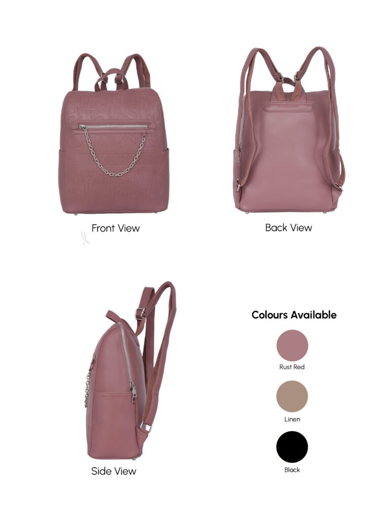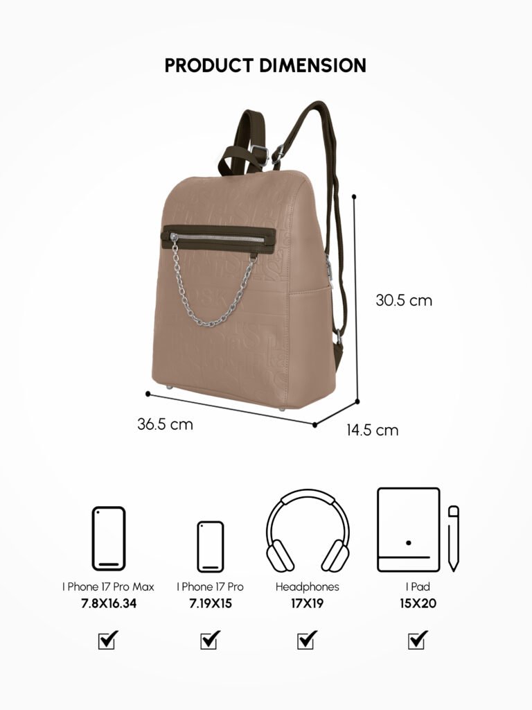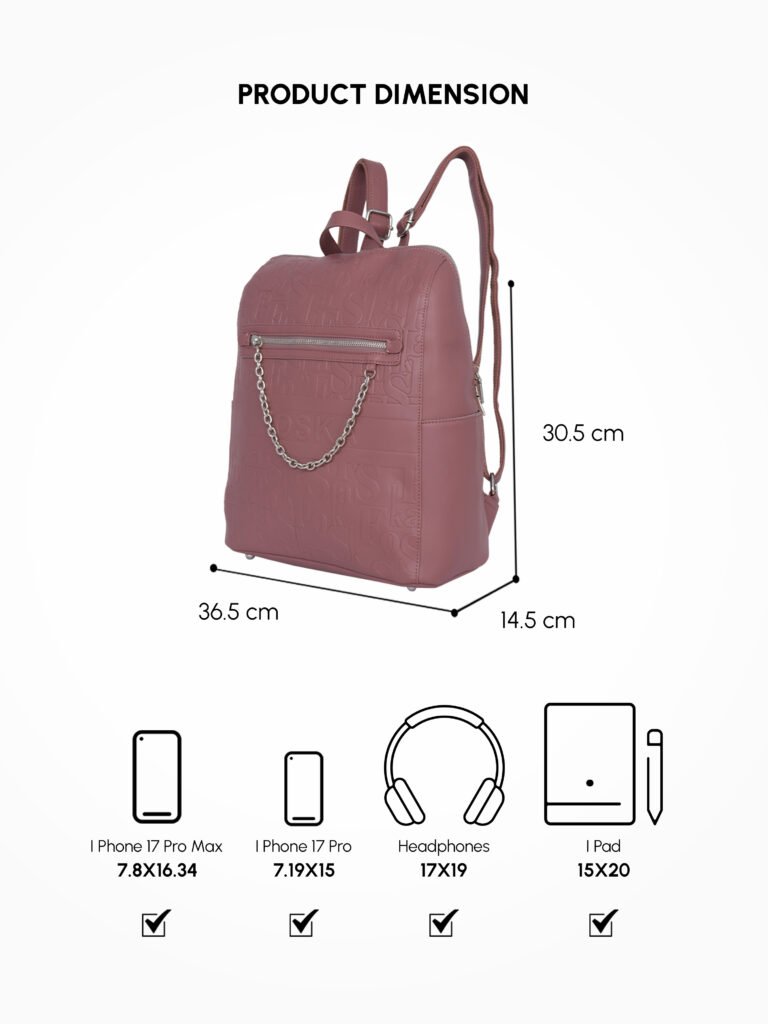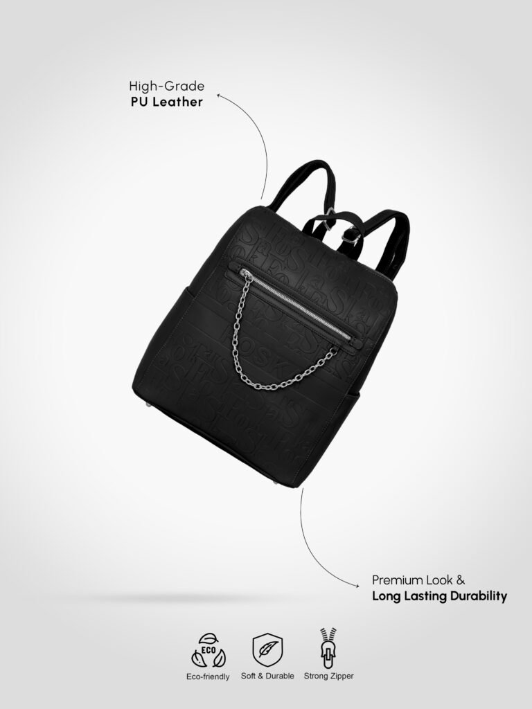 Design: Features a distinctive all-over embossed “”Foska”” logo pattern and a decorative silver-tone chain accessory on the front zipper pocket. It has a classic backpack silhouette with a secure top zipper closure.